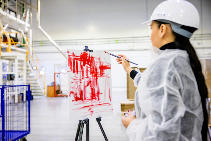 Я в первый раз на производстве. Больше люблю художников-импрессионистов, и пишу в этом стиле. Что меня поразило? Чистота, оборудование. Все отлично отражается на чистом полу. И я решила передать это отражение в своей работе.